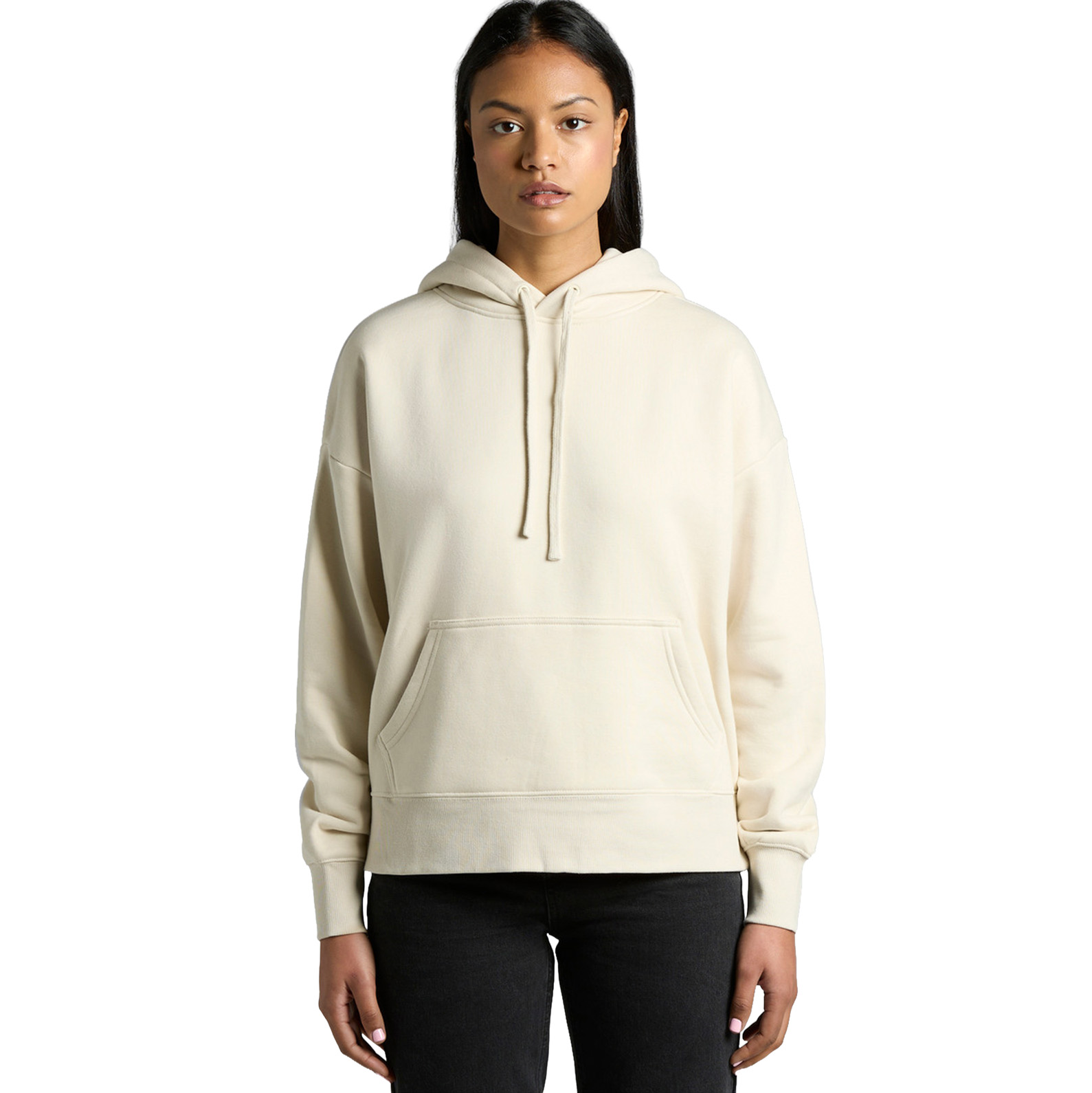 - Drop shoulder, pullover hood, CVC fleece, inset sleeves